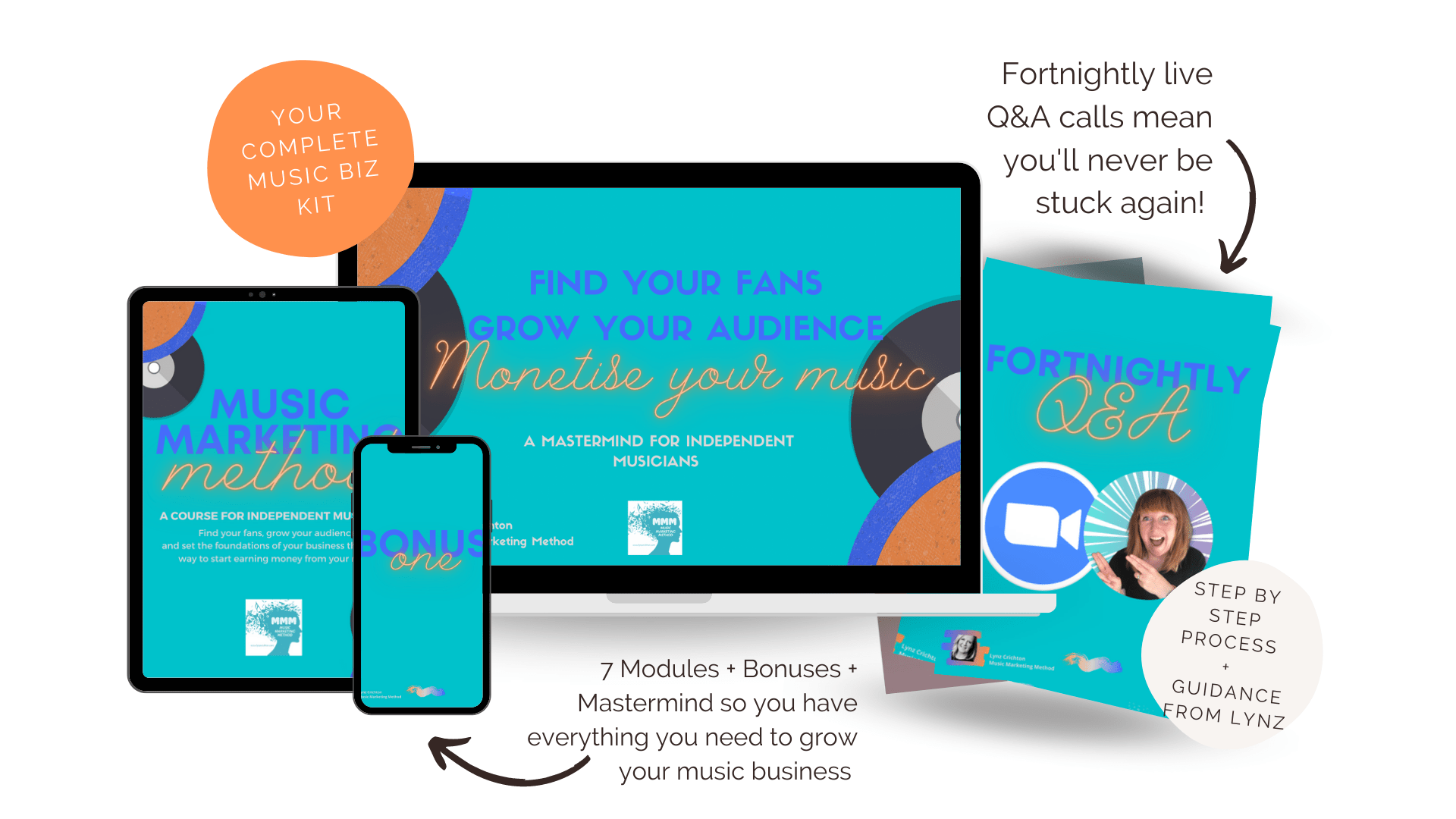 But that's not all! As a member of the Music Marketing Method, you'll also gain access to our exclusive Facebook community. This is a place where you can connect with other like-minded independent musicians, get your questions answered by Lynz or the wider community, and share your own insights and experiences. It's a supportive and empowering space where you can learn, grow, and succeed together.